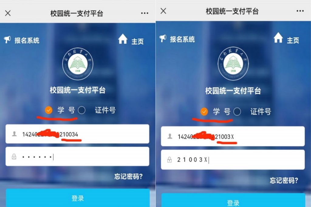 第四步:选择学号缴费,输入“身份证号码”,密码是“本人身份证后6位”;如果身份证号最后一位是X,密码后6位也包含X。