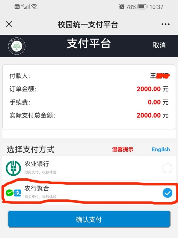 第七步:选择“农行聚合”打勾,然后点确认支付即可。里面包含微信和支付宝缴费方式,推荐使用微信支付方式。