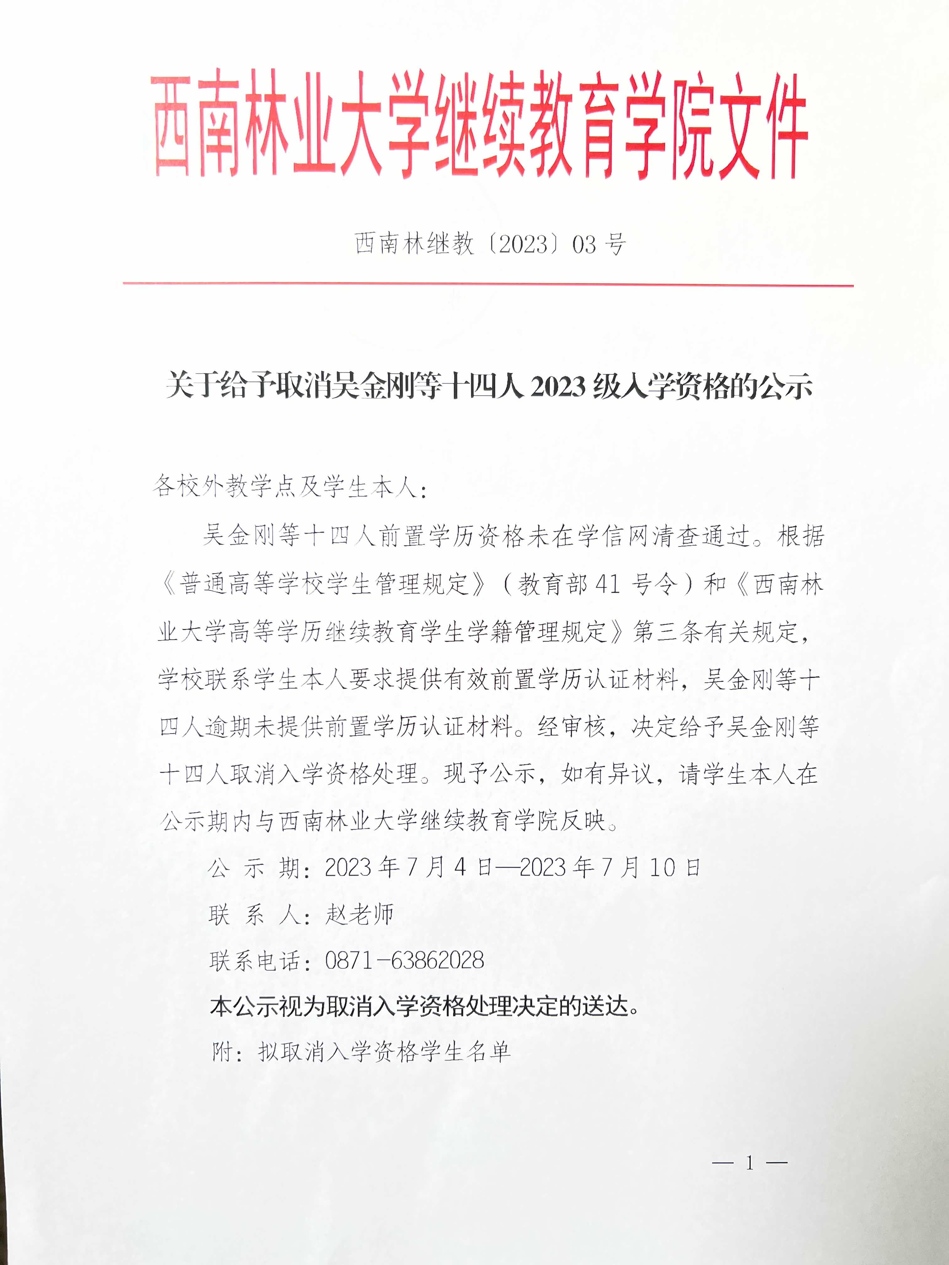 关于给予取消吴金刚等十四人2023级入学资格的公示